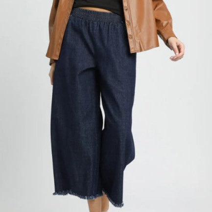 Washed Denim Wide Leg Pants with Fringe Hem