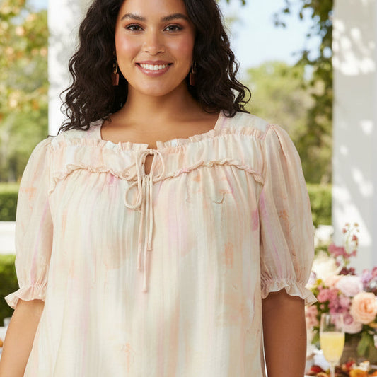 Women’s Watercolor Floral Top with Shirred Neckline & Adjustable Tie Front