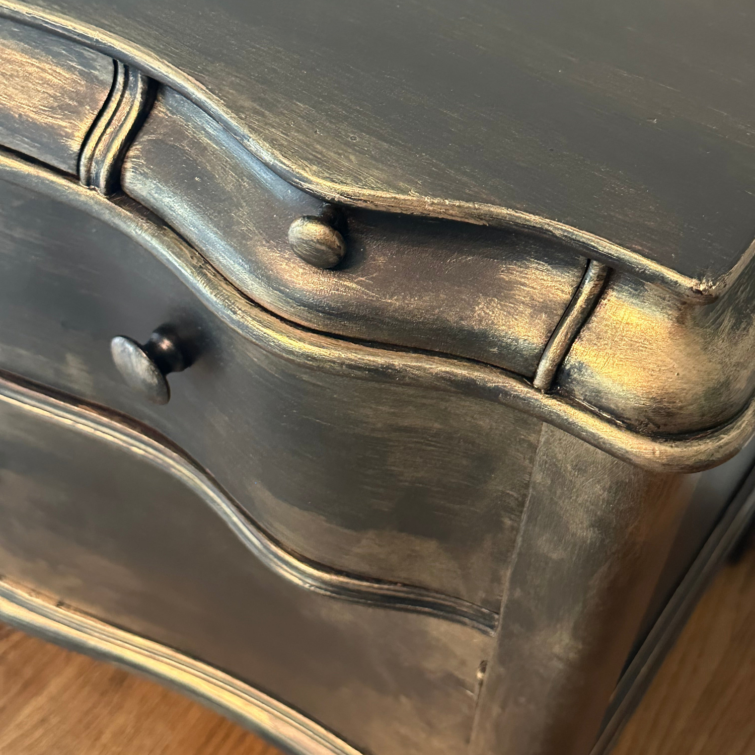 To create subtle shimmer, paint your piece with a Rethunk Junk by Laura® Furniture & Cabinet paint color that is close in tone to your selected metallic. Once the piece is painted, add the metallic accent in select areas over the base color. You can apply the metallic for full coverage or apply and dab off using a damp cloth for more of a faux finish effect.