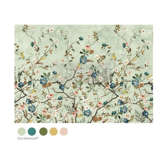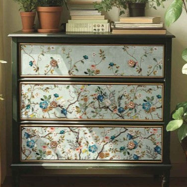 Delicate blossoms and blue florals dance across a soft green background in Blossom Perch A1 Decoupage Fiber, evoking the calm charm of a spring morning. This gentle, sprawling pattern is perfect for larger surfaces like dressers, doors, and panels—bringing a sense of freshness and tranquility to any room.