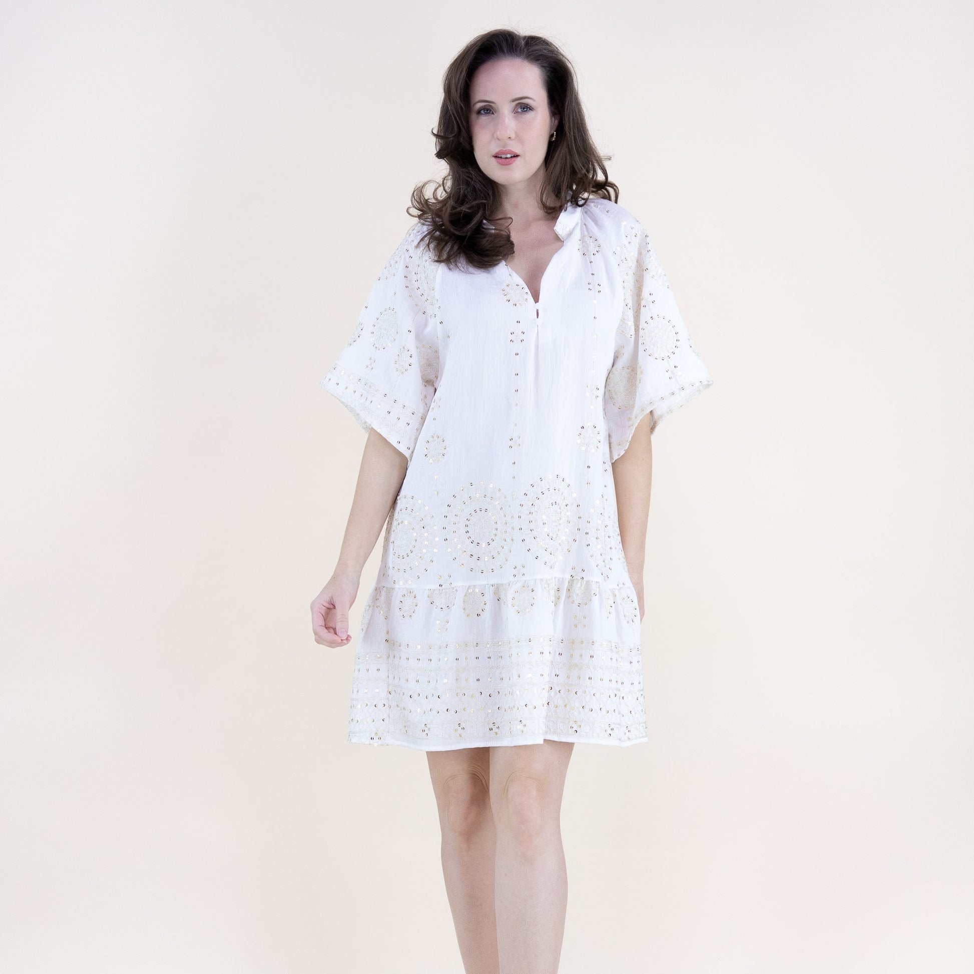 This white mini dress is both a bit delicate and boho and 100% perfect for spring and summer. The gold sequin medallion design has enough sparkle for you to make a splash at your next event. Or while just hanging out with friends! Pair it with some leggings for a more dressed down look.