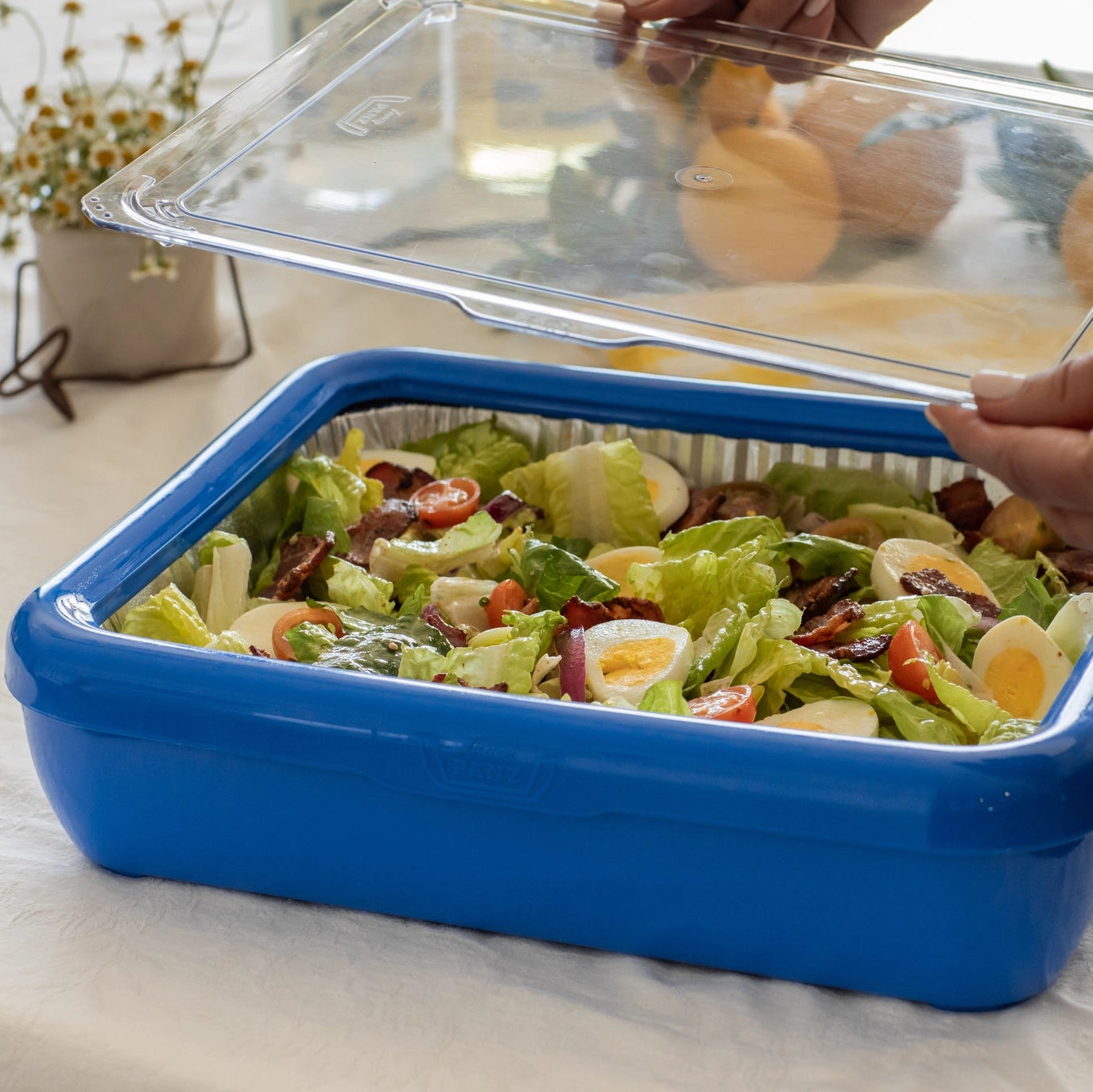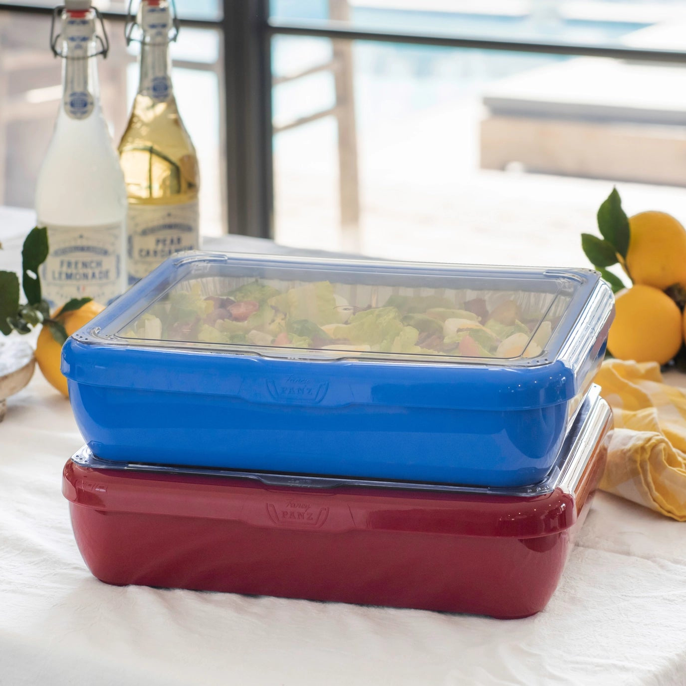 Take hot or cold food to your next event in a foil pan placed in a decorative Fancy Panz 2 in 1. When it's time to serve, simply remove the clear top and place it under your Fancy Panz where it nests perfectly. Leaving the party early? Simply remove the foil pan and leave the food at your event or dispose of the foil pan. You take your Fanzy Panz home! No more dirty dishes to bring home and NO MORE LOST SERVING DISHES!