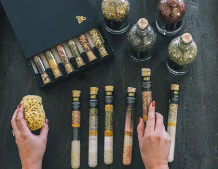 The mixture of mineral-rich sea salts, nourishing botanicals, clays, hydrating essential oils, and bee pollen gets poured into one of the included mesh soaking pouches and then dropped into your tub. After the ingredients dissolve in the warm water like a tea bag, you have an elegant bath that not only relaxes your muscles but moisturizes your skin.