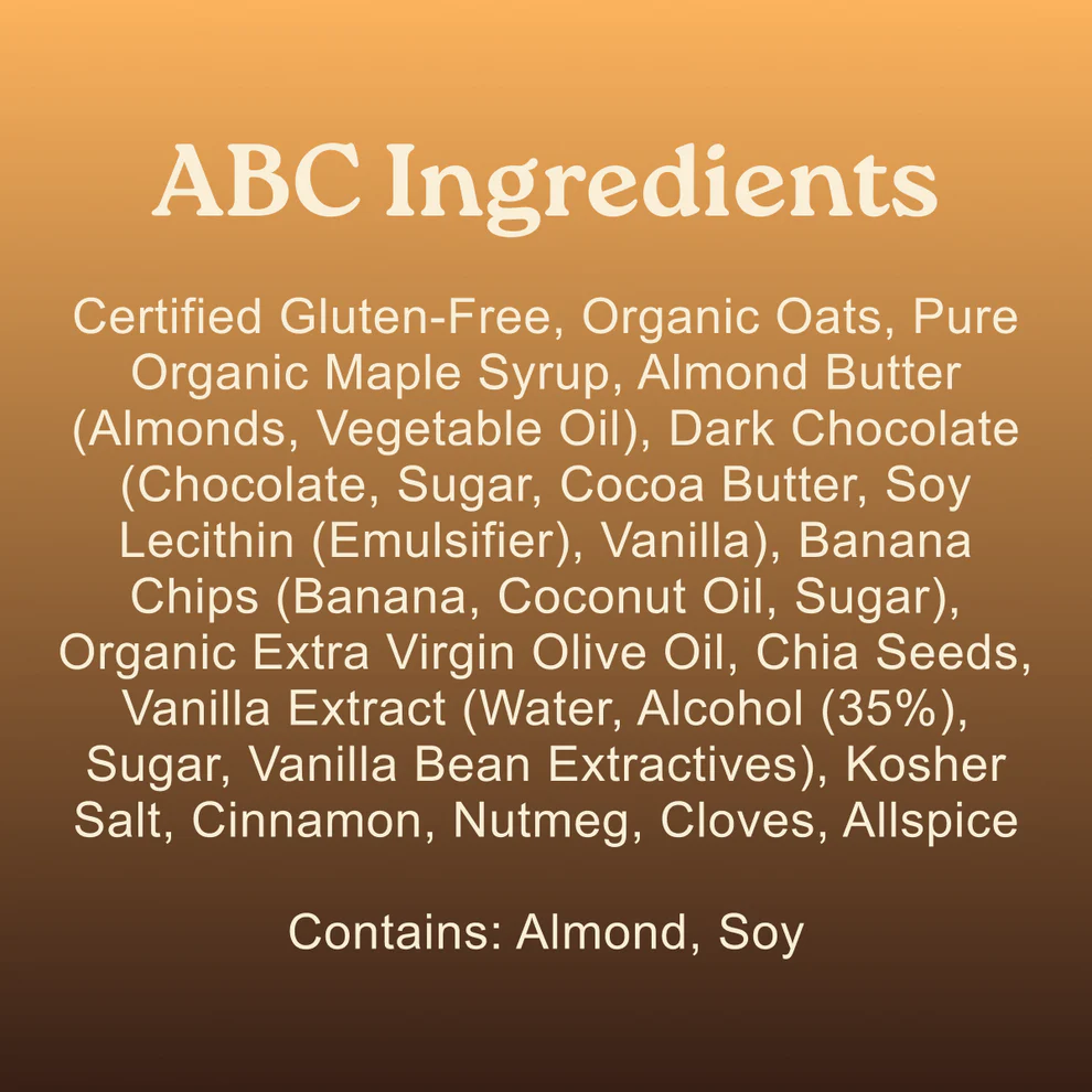 ABC is a trio worth remembering: creamy almond butter, crisp banana, and velvety dark chocolate. Each bite delivers a little nutty, a little sweet, and just enough indulgence to keep you coming back. Pair this coconut-free, vegan option with something sweet or something spicy.