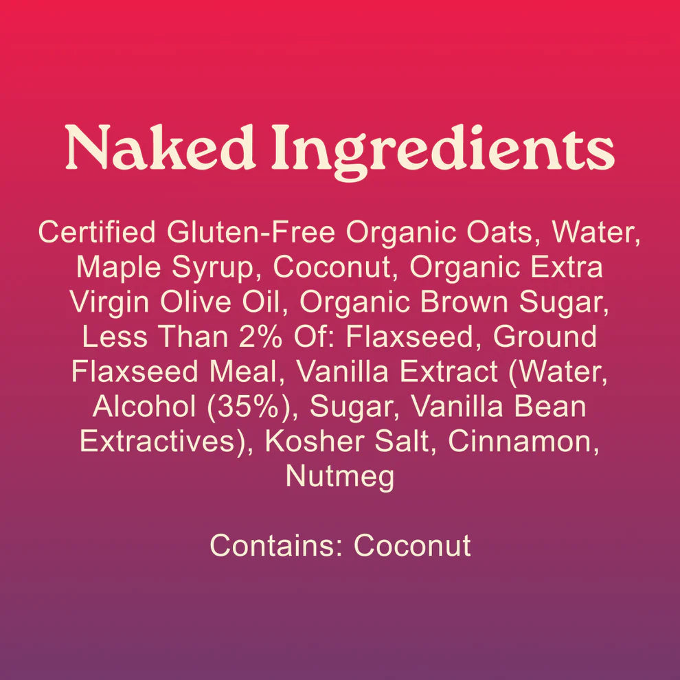 The Naked highlights the goodness of slow roasted oats, with coconut, maple syrup, and the taste of home. No nuts or fruit? No problem. Whether baking warm and sweet, or pairing with bold flavors like a tart or dark chocolate, enjoy a subtle and satisfying crunch for any occasion.