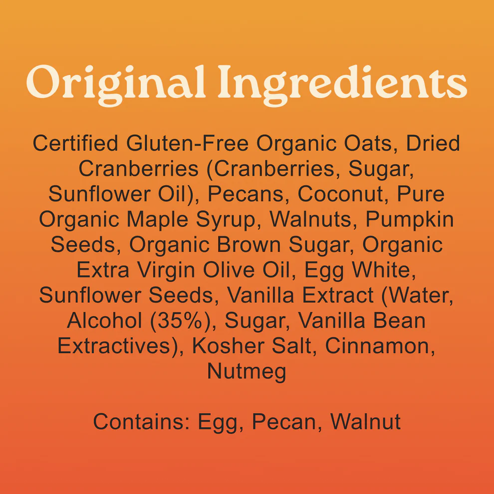 Original is where it all began. Enjoy balanced salty-sweetness in every bite with toasted walnuts, pecans, pumpkin and sunflower seeds, fresh coconut flakes, our signature dried cranberries, and of course, love. We prefer to let the Original shine by pairing it with foods that are light, earthy, crispy or creamy.