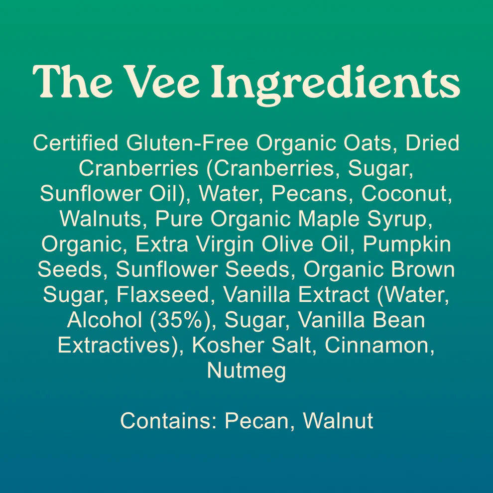 The Vee has the same Original goodies and is 100% Vegan, with organic gluten free oats, nuts, seeds and maple syrup. It brings a nutty bite to anything soft, crisp, or earthy. The Vee is for any one abstaining from animal products. We’ve mastered the same loving crunch and cozy flavor.