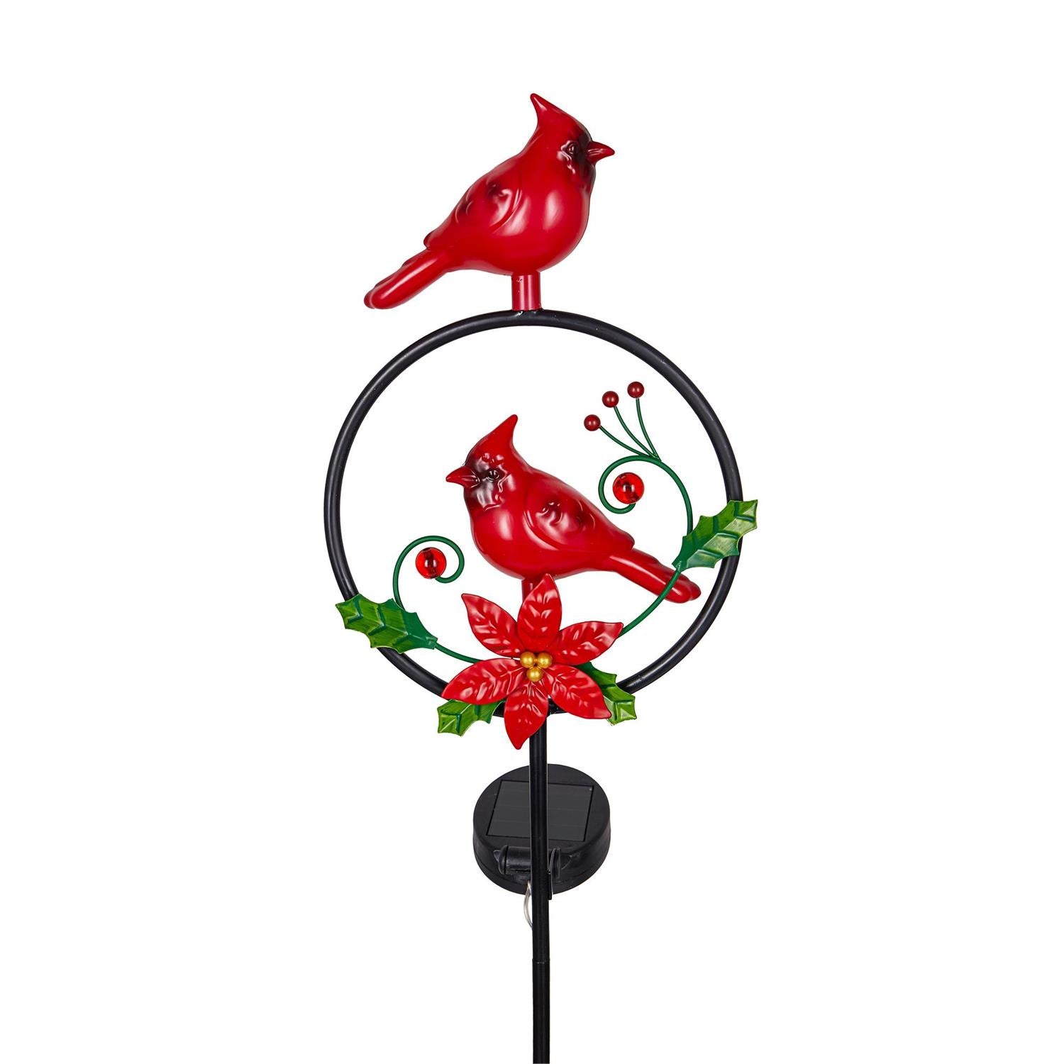 Delight everyone from friends and family to Christmas carolers with this solar garden stake. Choose from two designs with sweet cardinals and Christmas foliage like berries. With solar lights that illuminate the design when night falls, this garden stake is the perfect addition to any outdoor space for an extra dose of color. Crafted of outdoor safe and weather-resistant materials, it's ideal for sprucing up any garden. Allow the solar panel to receive up to 6 hours of direct sunlight for best results. The sturdy h-stake allows for easy display in damp soil.