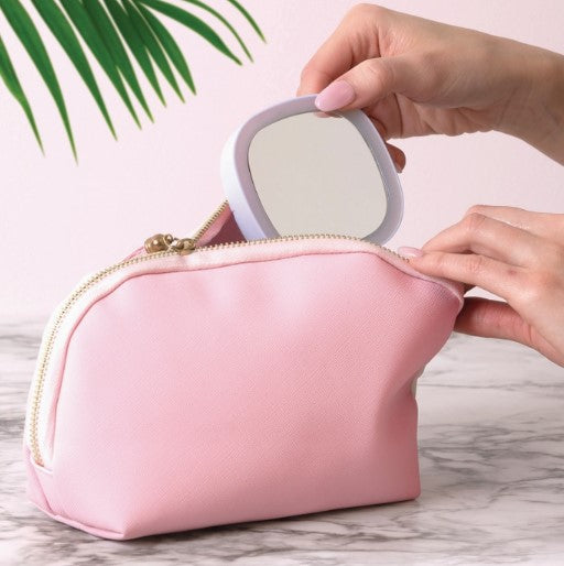 Achieve the same flawless looks at home and on the go with our favorite secret weapon - the mini makeup mirror. Cute and compact, this little life saver glows bright with 12 LEDs, 2 levels of intensity, a pop-out stand and true-to-you magnification. Batteries are included and you have three colors to choose from. Pop one in your purse, pack back or carry on and you are good to go!