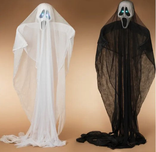 This lighted fabric ghost will make add a spooky touch to your Halloween display! Can be displayed upright or hung from a ceiling or porch.